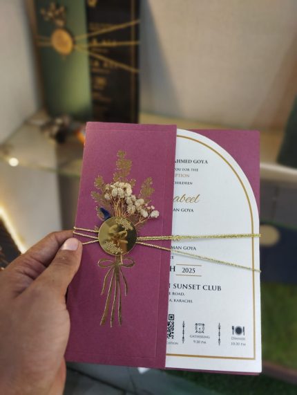 Pinkish Mehroon Names Foiled Printed Envelope with Arch Shape Floral Inner