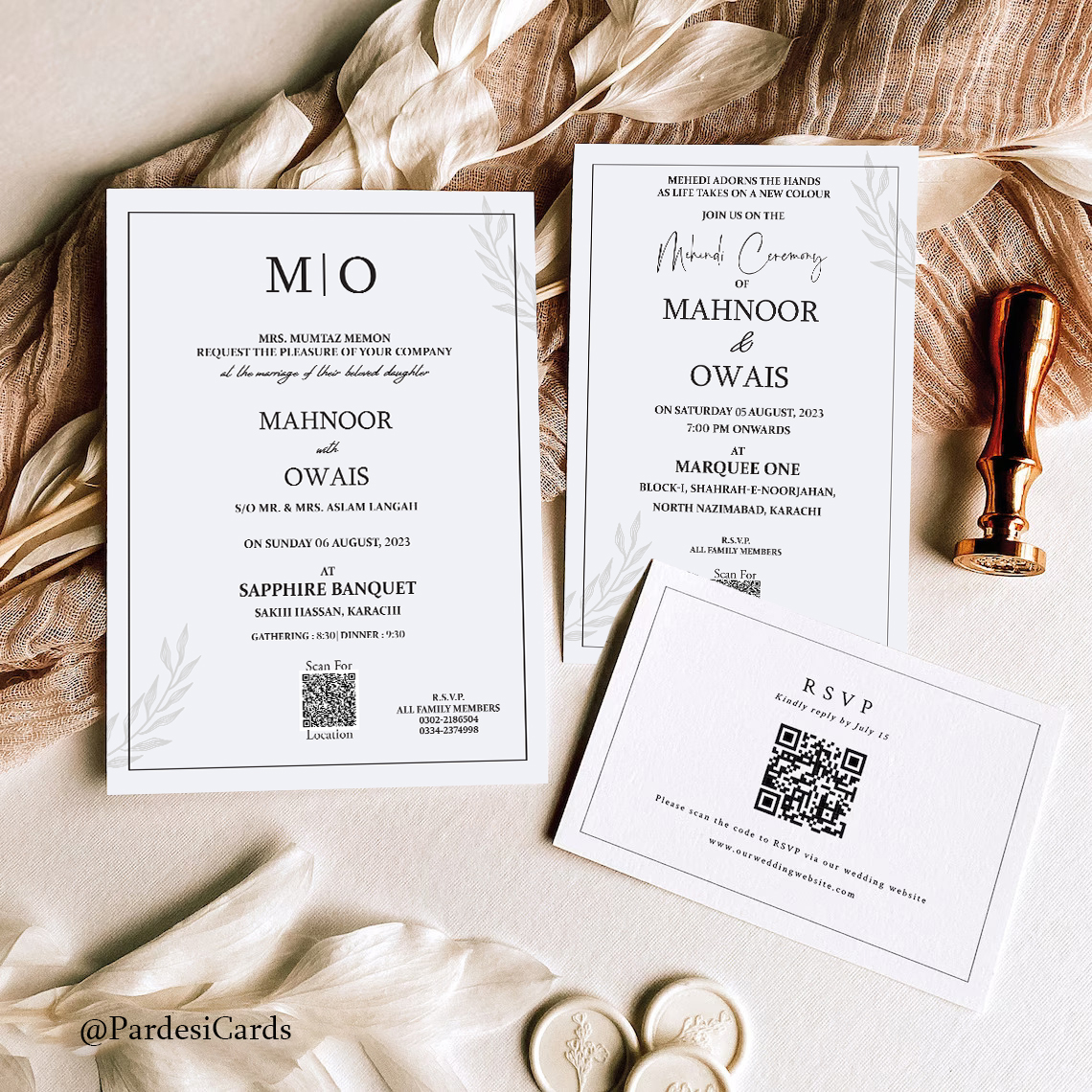 Each card is designed to complement the others, with a consistent theme of elegance and simplicity. The cohesive design ensures that all three events are beautifully presented while keeping each ceremony’s unique significance clear. The high-quality cardstock gives the set a luxurious feel, while the clean white background allows the text and small decorative accents to stand out.