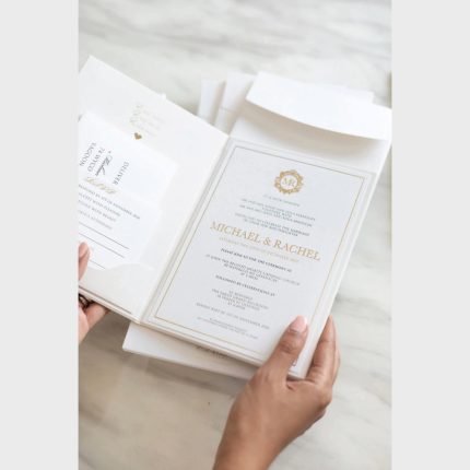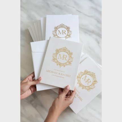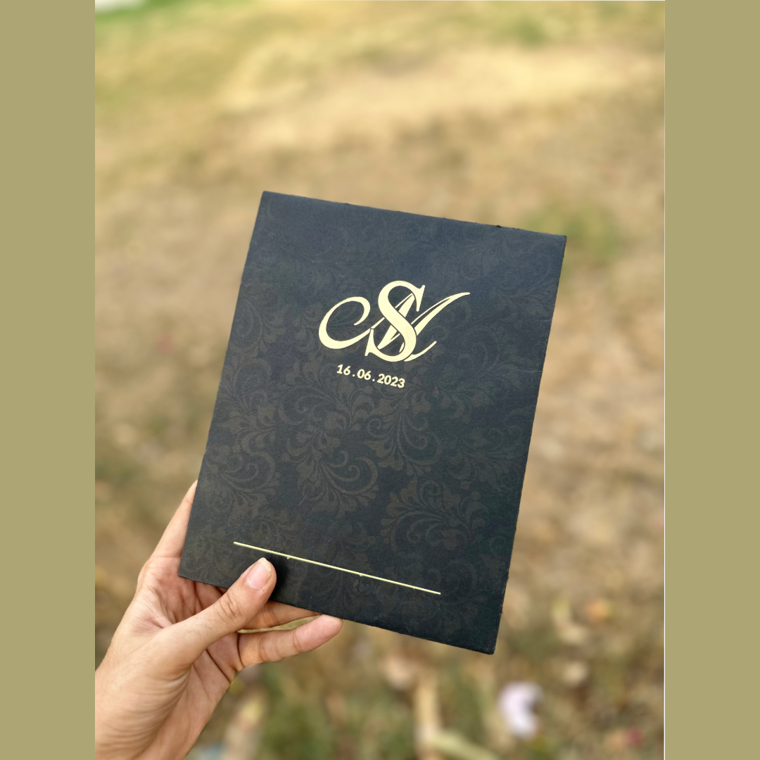 - Black envelope with personalized embossing of the first letters of the bride and groom’s names
