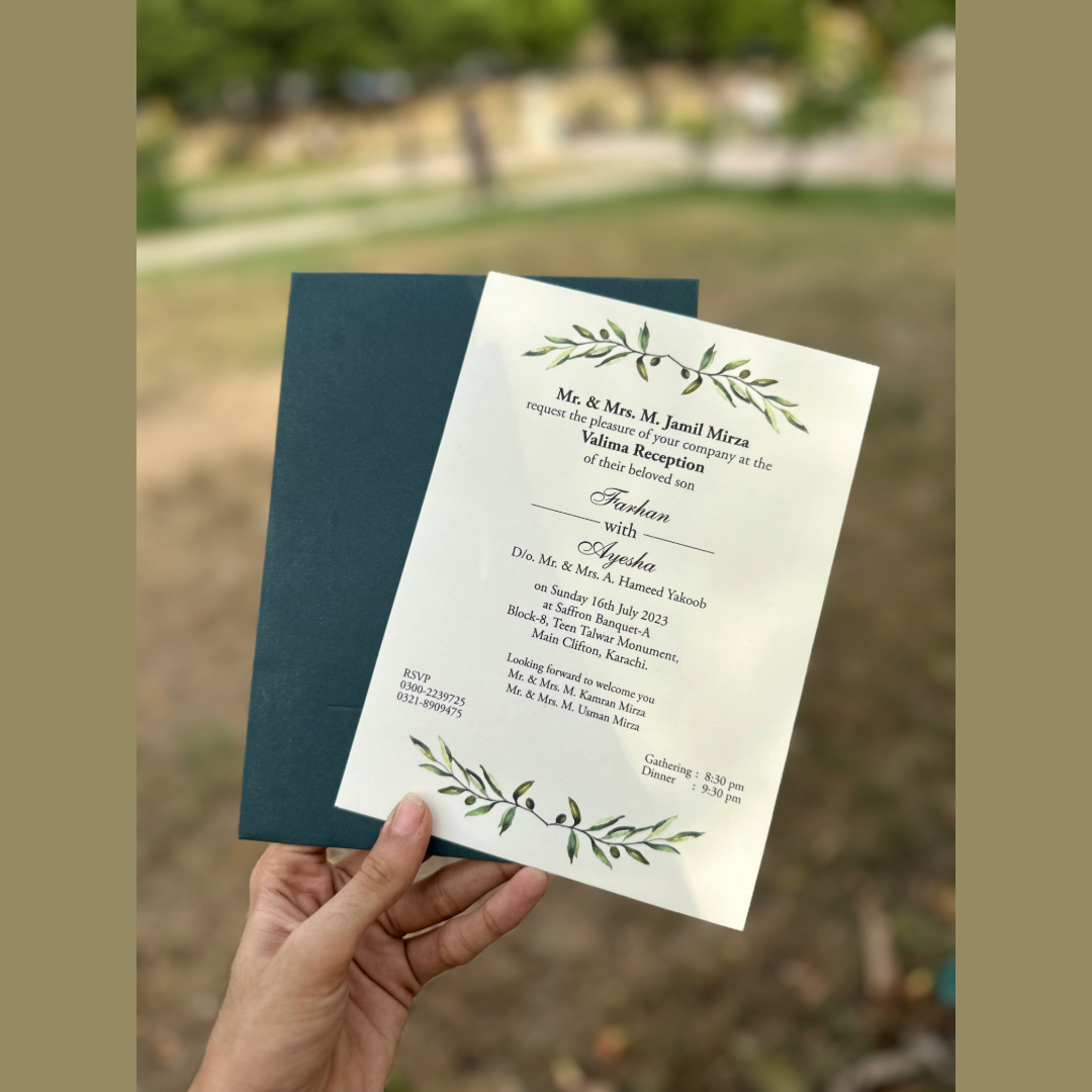 This sophisticated invitation set features a card with a minimalist yet elegant design. The card is beautifully accented by green floral chain borders running across the upper and lower edges, creating a delicate and natural aesthetic.