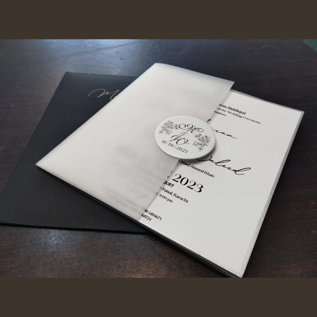 On the back of the envelope, the names of the bride and groom are elegantly printed in a stylish font, adding a personal and intimate touch to the overall design. This understated yet classy combination of white and black creates a refined, polished look that is perfect for couples who appreciate subtle elegance.